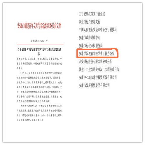 根据《关于2019年度安康市青年文明号创建结果的通报》安青文发【2020】1号文件精神,伟德体育伟德体育官方网站员工工作办公室在2019年度青年文明号创建活动中,有效发挥了青年文明号在提高青年职工素质、弘扬职业文明、加强基层管理和构筑社会信用体系中的积极作用,安康市创建青年文明号活动组委会决定命名伟德体育伟德体育官方网站员工工作办公室为“2019年度安康市青年文明号”。