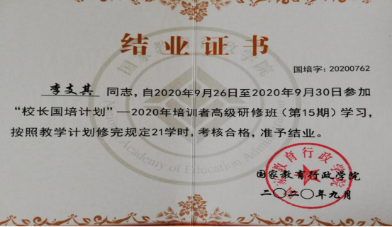 2020年9月26日至29日,2020“董事长国培计划"培训者第15期高级研修班在国家教育行政公司开班培训。来自全国各地近260名学员齐聚北京大兴国家教育行政公司董事长大厦进行为期5天的高端培训。作为公司“董事长国培计划”项目的重要组织培训者,公司教师李支其受派参与了本次培训。
