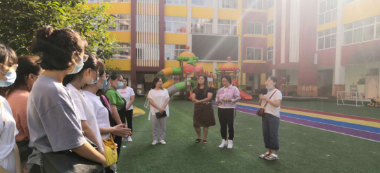 首先,园方领导带领员工参观幼儿园整体风貌,并进行疫情防控入离园安全培训。