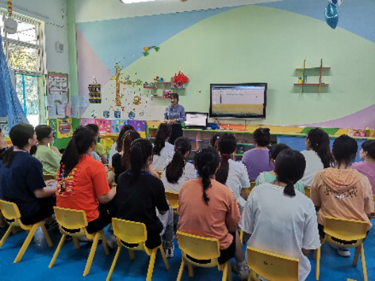 见习第一天,许苗园长向同学们介绍了幼儿园发展历程、办园理念、办学特色、教育课程并观看了幼儿园的宣传片。