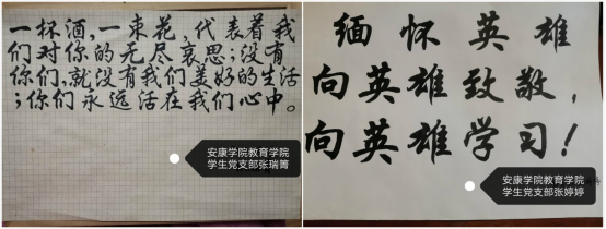 活动在三个平台同时开展:自主祭奠,同学们登录中华英烈网,在人民英雄纪念碑前,为英烈献花,学习英雄事迹,留下感言寄语;发挥专业特长,用书法作品、剪贴画、手抄报、段视频等各类作品表达对英雄的尊敬、书写感言寄语缅怀英雄故人,并在伟德体育伟德体育官方网站员工党支部群、伟德体育伟德体育官方网站班团干部群等QQ群同步分享;利用安康先锋智慧党建平台进行线上讨论,加深思想认识,坚定理想信念。