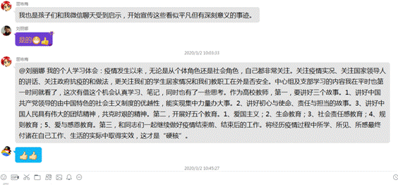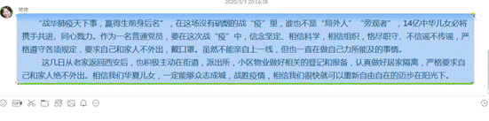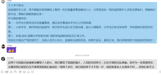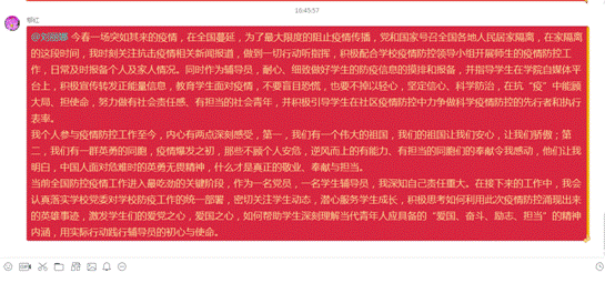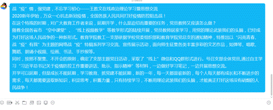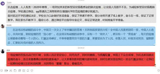 通知发出后,大家的积极性和参与度非常高,支部全体党员纷纷在QQ群里发表自己的学习感悟,互相讨论和交流学习心得体会。分别交流了近日追踪疫情报道、居家办公的感受,并结合自身工作学习生活,表达了虽不能奋战在抗击疫情的第一线,但对中国疫情防控的必胜信念、对中国特色社会主义制度的强大自信,以及对公司相关领域制度建设的关注和探索。