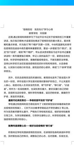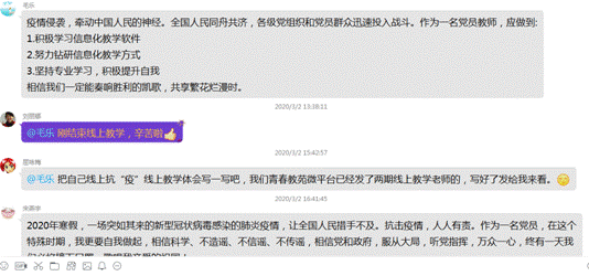 2020年2月27日,在全国坚决打赢疫情防控的人民战争总体战阻击战的形势下,在公司广大师生员工开展线上教学、居家办公的特殊时期,伟德体育伟德体育官方网站教工一支部依据公司党委和教育公司党总支的通知精神,在“线上”开展了“疫情防控、党员先行”主题党日活动。本次党日活动内容包括:①党员个人重温入党誓词;②自主学习“习近平总书记关于疫情防控工作重要讲话、批示指示精神”等材料;③利用QQ群谈各自感悟,进行线上思想交流活动。