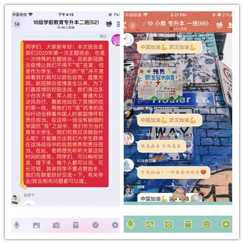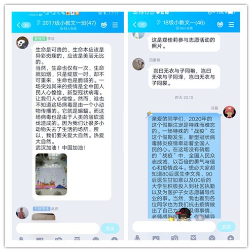 为深入贯彻习近平总书记关于打赢疫情防控阻击战重要指示精神,按照安康公司党委关于疫情防控的战略部署,充分发挥网络育人、网络思想引领的功能,进一步落实将思想政治教育、爱国主义教育与防疫防控工作相结合的工作思路,教育公司党总支统一安排、周密部署,公司学工办、团总支组织全体辅导员通过微信群、QQ群、钉钉直播等各类网络平台开展了以“线上心连心 携手共战“疫””为主题的线上主题班会及特色团日活动。