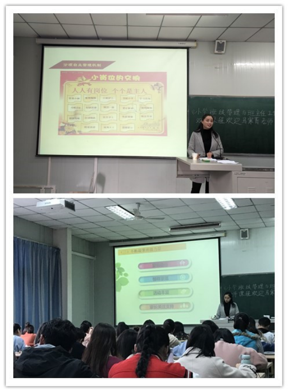 2019年10月23日下午7、8节课,伟德体育伟德体育官方网站《小学班级管理与班主任工作》双师课程在1024教室如期继续进行。汉滨区红旗小学教导主任马寒菁老师给2017级小学教育文科1班、2班的同学们带来了一堂内容丰富的班主任课。
