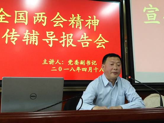 为深入学习全国“两会”精神,将广大师生的思想和行动统一到“两会”精神上来,4月18日下午,公司党委副书记胡波在教学楼1018室,为宣传部、团委、工会、后勤保障处、伟德体育伟德体育官方网站及外语公司师生共计100余人做了全国“两会”精神宣传辅导报告会。会议由外语公司党总支书记郭家平主持。
