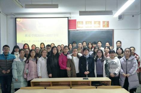 会议伊始,团总支副书记翟艺芳代表团总支对16级新评选的各班班干部表示了祝贺和欢迎,接着从15级小教文一开始,各班的班长、团支书和组织与宣传委员依次上台做自我介绍,然后由各班团支书对本班开学以来的工作进行总结汇报并对本学期后期工作做计划陈述。各个班级的汇报,有所长,有所望。各有不同,也有相同。在听了同学们的述职之后,赵晓凤老师进行了总结致辞,赵老师提到,例会的意义应该在于交流和相互学习,各班干部应该经常相互交流,取长补短。同时,通过总结各班的工作汇报,赵老师对各班的班团建设也提出了一些建议,最后,赵老师又着重强调了感恩月的意义,传达了感恩活动精神思想,并对感恩月活动做出相关指导部署。