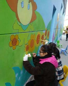 幼儿是与环境相互作用来学习的。为给幼儿创设温馨舒适、美观有序的生活和学习环境,充分发挥环境的隐性教育作用。这些同学们在金老师的指导下,在寒冷的冬天里,齐心协力、共同动手,为孩子打造了一个洋溢着童趣的墙面环境。同学们在高达3米墙面上绘画,在板凳上、铁架上爬上爬下辛苦工作了2天。原本空白的墙上变成了碧绿的草地、湛蓝的天空,小猪、小猴、小鸭各种小动物快乐地游戏着。向日葵幼儿园的幸运物“向日葵宝宝”也被同学们画了进去。