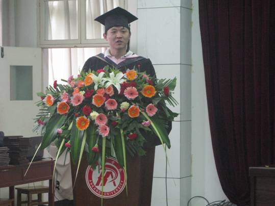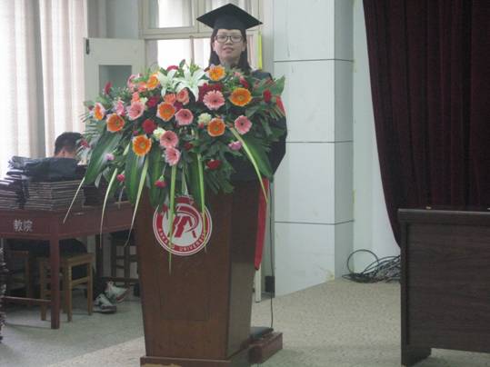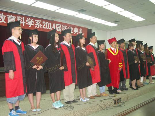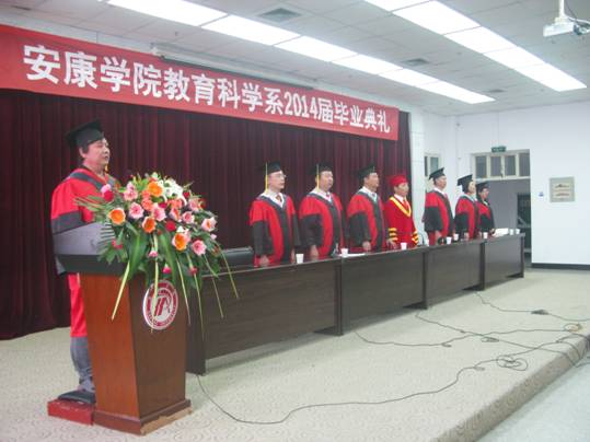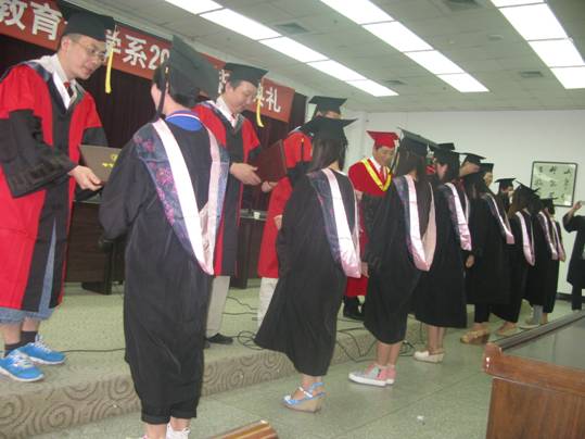 首先,教育科学系党总支书记王辉老师致开幕词并主持本次典礼。胡鸿晓教授、黄路阳教授和教研室主任王贞惠老师分别讲话,表达了他们对2014届毕业生浓浓不舍之情和走上社会后的殷切期盼。其次,由系副主任权大学老师宣读了毕业晚会优秀演员、2014年届毕业生三好员工、优秀班干部和优秀团员的名单。最后,也是最庄严、最激动的时刻——拨穗礼!由各位导师把员工头上学士帽的流苏从右边换到左边并授予学士学位证书,这代表稻穗或麦穗的成熟,象征毕业生已学有所成,可以展翅高飞。