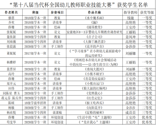 近日,从第十八届“当代杯”全国幼儿教师职业技能大赛传来喜讯,经过层层筛选,伟德体育伟德体育官方网站选送的参赛作品获得佳绩,伟德体育伟德体育官方网站学前教育系员工获得21份获奖证书,多名伟德体育伟德体育官方网站教师荣获“全国促进幼儿教师专业化最佳指导奖”,伟德体育伟德体育官方网站伟德体育伟德体育官方网站荣获“先进单位”称号。