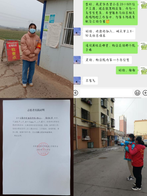 周丽娜,张梦娜,刘莎等,在社区参与防疫检查,及时做好对过往外地车辆、人员以及本地出租车与乘客进行检查、登记,走访及记录返乡人员。