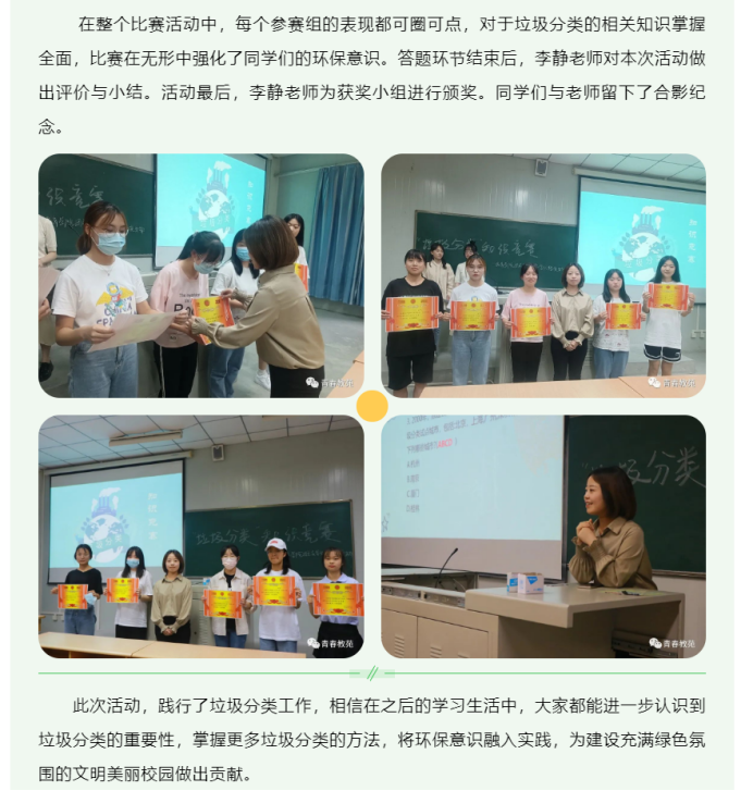 为进一步践行垃圾分类工作,培养同学们的环保意识及能力。伟德体育伟德体育官方网站于2022年5月开展了“垃圾科学分类,文明你我同行”线上宣传倡议活动,并线下举办了“垃圾分类”知识竞赛,以帮助同学们树立环保意识、营造良好校园文明风尚。