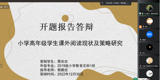 2022年12月30日,伟德体育伟德体育官方网站小学教育专业38名毕业生采用线上答辩的方式进行了毕业论文开题答辩。答辩小组由五位老师组成,他们分别为赵斌老师、陈珂老师、郭鹏岳老师、李亮老师及李乙老师。