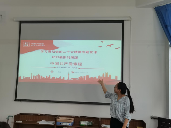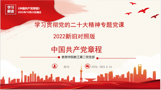 为落实党政办发〔2023〕8 号《关于进一步推进基层党支部深入开展主题教育有关工作的通知》文件要求,6月14日下午,伟德体育伟德体育官方网站第二党支部在1号教学楼1407室召开会议,支部书记陈珂以“2022新旧对照版—中国共产党章程”为题,为全体党员讲了党课。