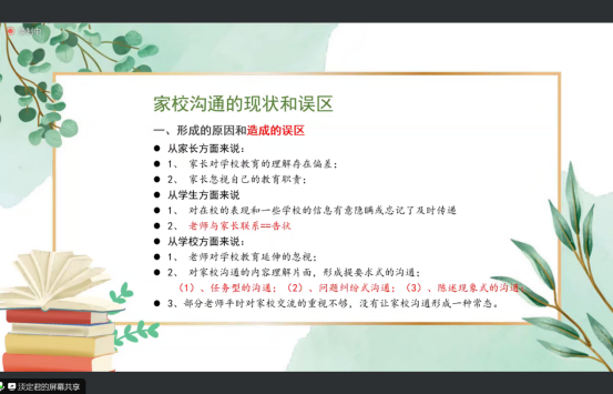 讲座由两部分组成。第一,课程讲授。李支军老师从家校沟通的现状、沟通关键开讲。其中提到“沟通心理学效应、相处基本原则等八个关键点,都是多年班级管理的经验总结。讲座中提到的沟通案例,都是鲜活的教育实践。第二,员工答疑。同学们踊跃发言,把将自己心中的疑惑充分表达,李支军老师耐心讲解。课后,同学们纷纷表示在李支军老师饱含教育情怀的课程上收获颇丰,使自己重新认识了班主任对员工的教育意义和功效。通过双师教学,同学们不仅学到了班主任积累的丰富的管理经验,也从双师授课教师的身上学到了班主任不畏困难、严谨治学、专心教学的优秀品质。
