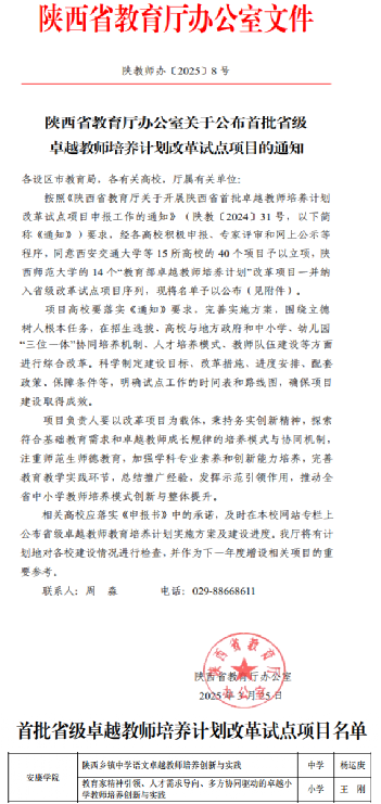 近日,陕西省教育厅公布了首批省级卓越教师培养项目获批名单,公司王刚教授牵头申报的“教育家精神引领、人才需求导向、多方协同驱动的卓越小学教师培养创新与实践”项目经过积极申报、专家评审和网上公示等程序,在激烈角逐下获批立项。