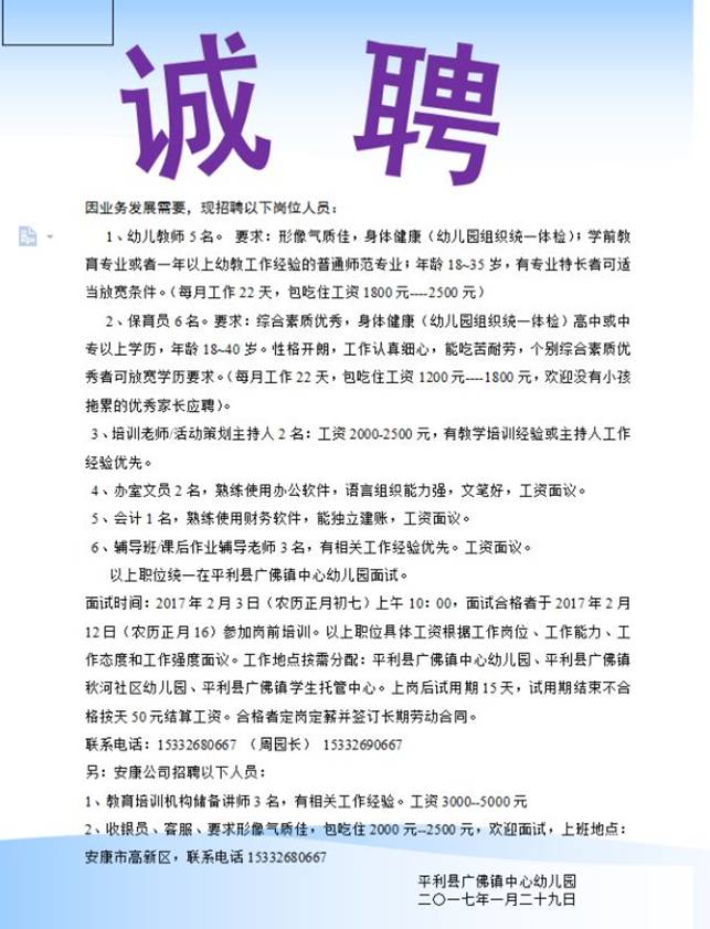 招聘信息二:平利县广佛镇中心幼儿园