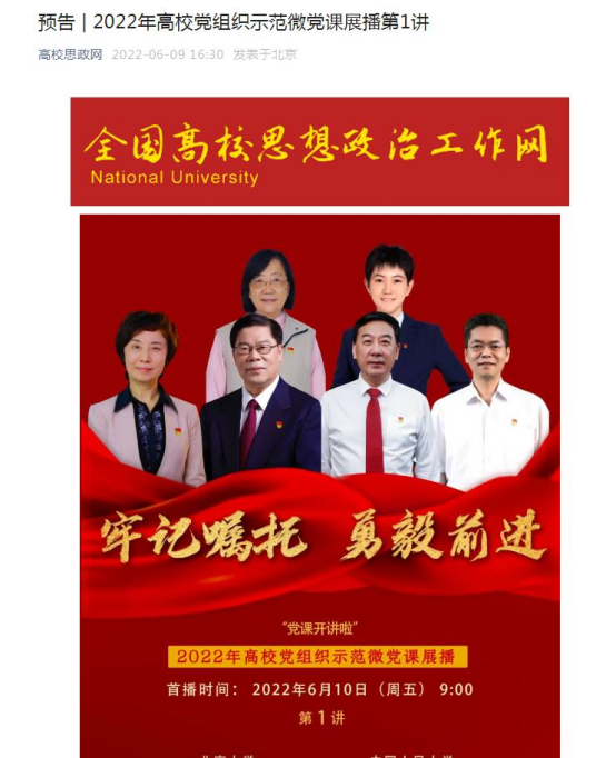 6月10日上午九点,2022年高公司党组织示范微党课展播第1讲,由教育部思想政治工作司主办,全国高校思政网直播,分别在新华网、光明网、人民网、共产党员网学习强国、央视频、微言教育全国高校思政网、中国老员工在线视频号、微博、B站、快手、百家号等同时播出
