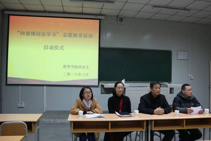 在校团委的号召下,由公司团总支组织的“向雷锋同志学习”志愿服务活动启动仪式于2016年3月11日16:00在1016教室举行。参加本次启动仪式的有:教育公司党总支书记屈咏梅、经理黄路阳、学工办主任赵斌、团总支书记董婷瑜、15级小教理和15级学本二班全体同学,活动由学工办主任赵斌主持。