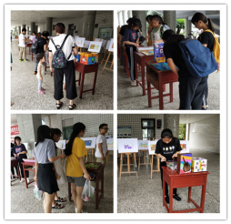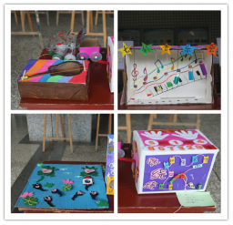展出的作品形式多样,内容丰富,构思巧妙。例如,同学们用不用的纸箱只做了简单精巧的投篮框,和用一些纸箱制作的星空望远镜;用废旧纸板制作的益智积木和类似大富翁的益智小游戏;还有用绳子、瓶盖和废纸箱做成的小动物找家的玩具;一些同学用她们的巧手做成了漂亮的七彩音乐盒;还有用奶粉盒制成的踩高跷;还有许多像“绕绕绕”、“小吉他”、“时尚小火车”之类的环保小作品,既实用又很有教育意义。