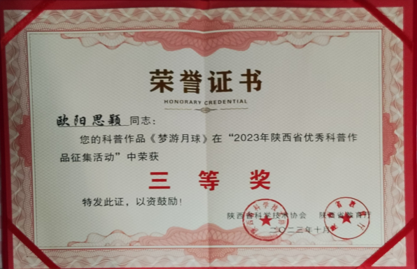 为努力打造高质量科普服务体系,鼓励广大科技工作者和社会各方投身科普创作,繁荣科普创作环境,丰富原创科普资源。近日,在陕西省科协、陕西省教育厅联合开展的2023年度陕西省优秀科普作品征集活动中,由公司教师陈佳指导的2022级小学教育理科班员工欧阳思颖作品《梦游月球》荣获大赛三等奖。